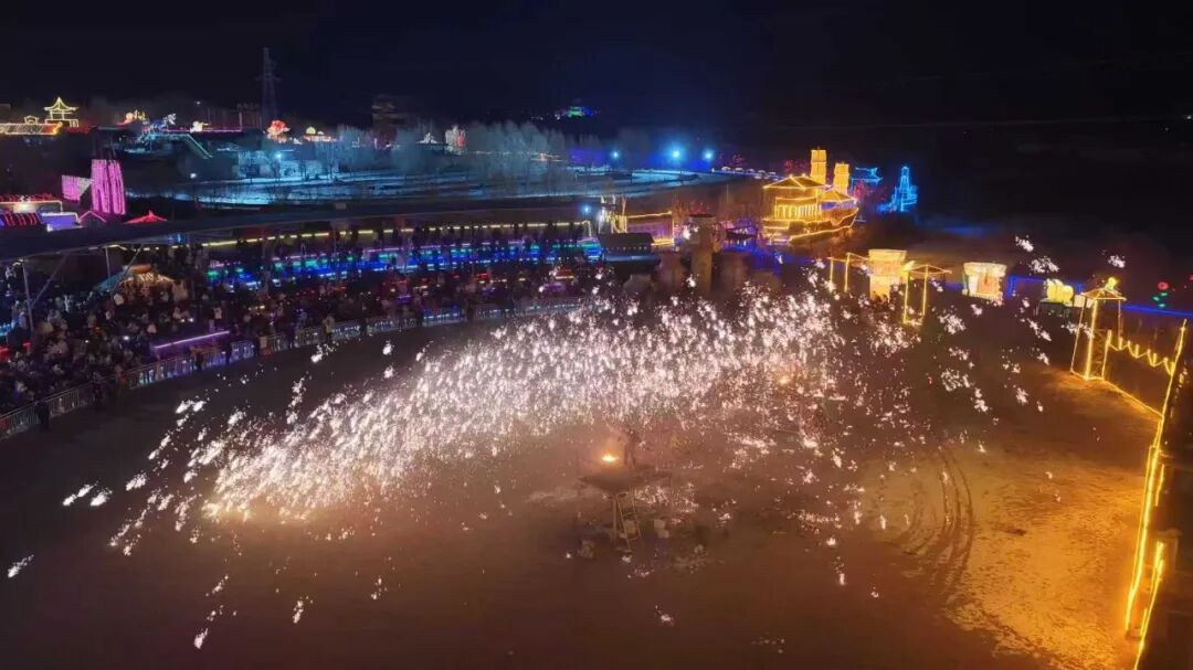 “怀旧跨年派对”上,经典老歌与北疆民乐交织奏响,身着老包头传统服饰的演员穿梭在街巷之中,沉浸式再现百年商埠的繁华盛景,让游客仿佛穿越时空,触摸历史的温度。而马术剧场内的非遗“打铁花”表演,更是将当晚的氛围推向高潮。1600℃的炽热铁水被艺人奋力泼洒,瞬间化作漫天璀璨“星辰”,金雨般洒落夜空,将古城映照得如同白昼。这门古老的非遗技艺,以震撼人心的视觉冲击力,让现场观众深深感受到传统文化的厚重与神奇。紧随其后的飞天秀更添浪漫意境,身着霓裳羽衣的表演者乘威亚凌空而起,舒展水袖、散花祈福,灵动的身姿与古城夜景交相辉映,宛如仙境降临。