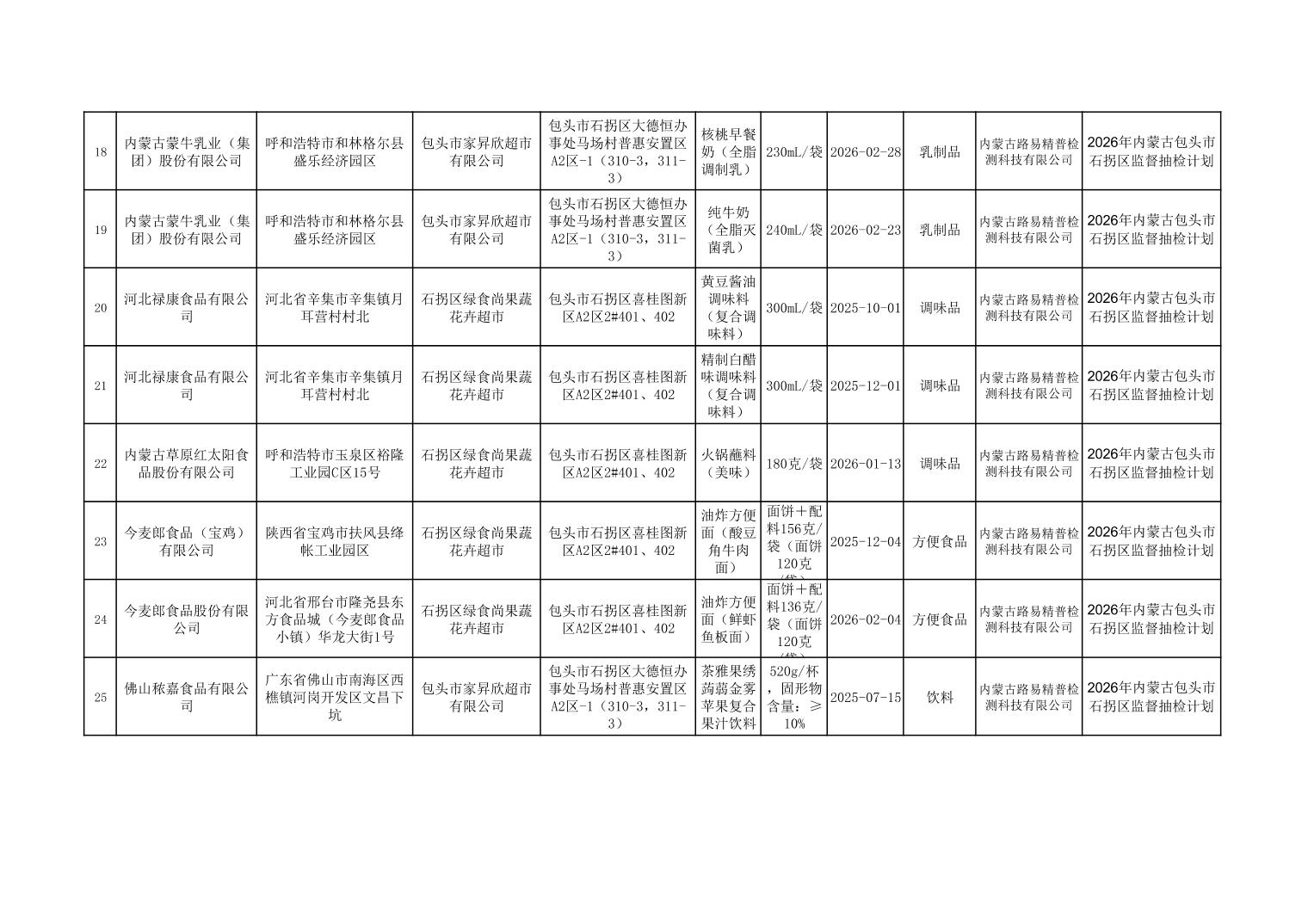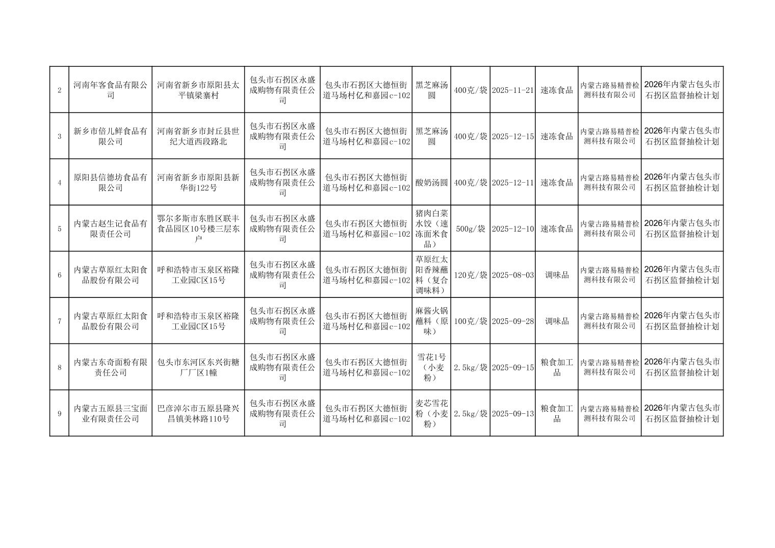 石拐区食品安全监督抽检合格产品信息