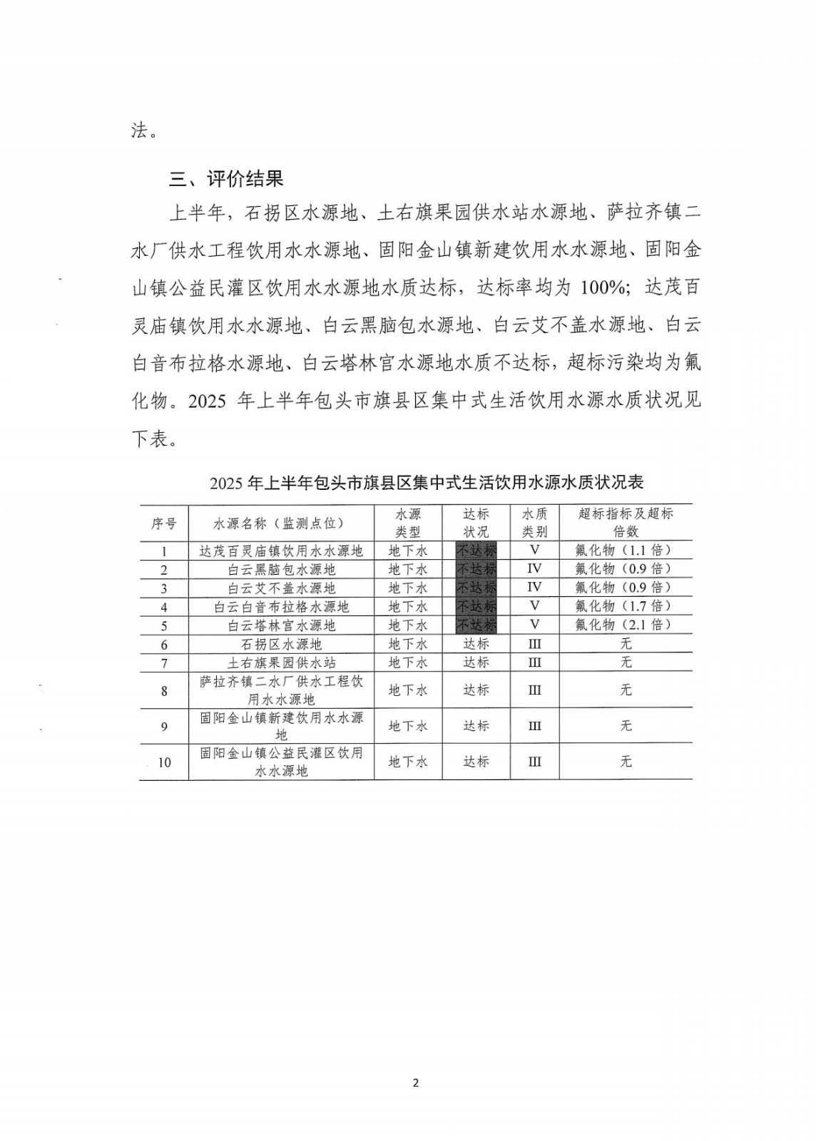 2025年上半年包头市旗县区集中式生活饮用水源水质状况报告