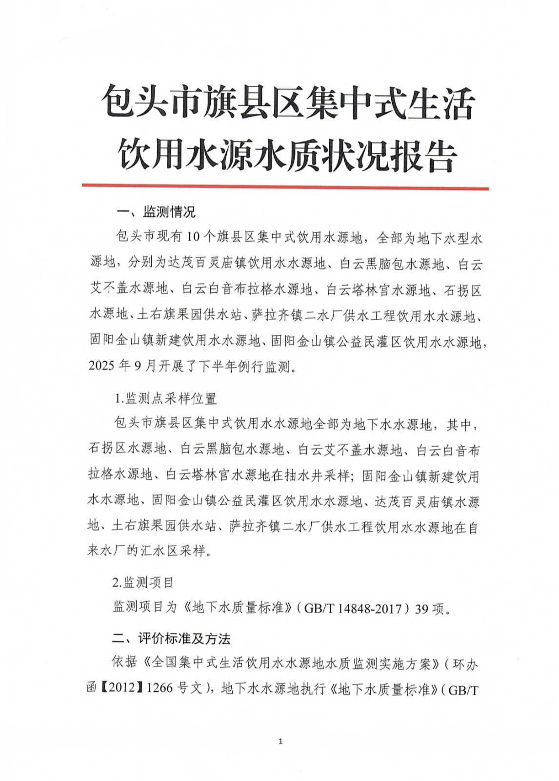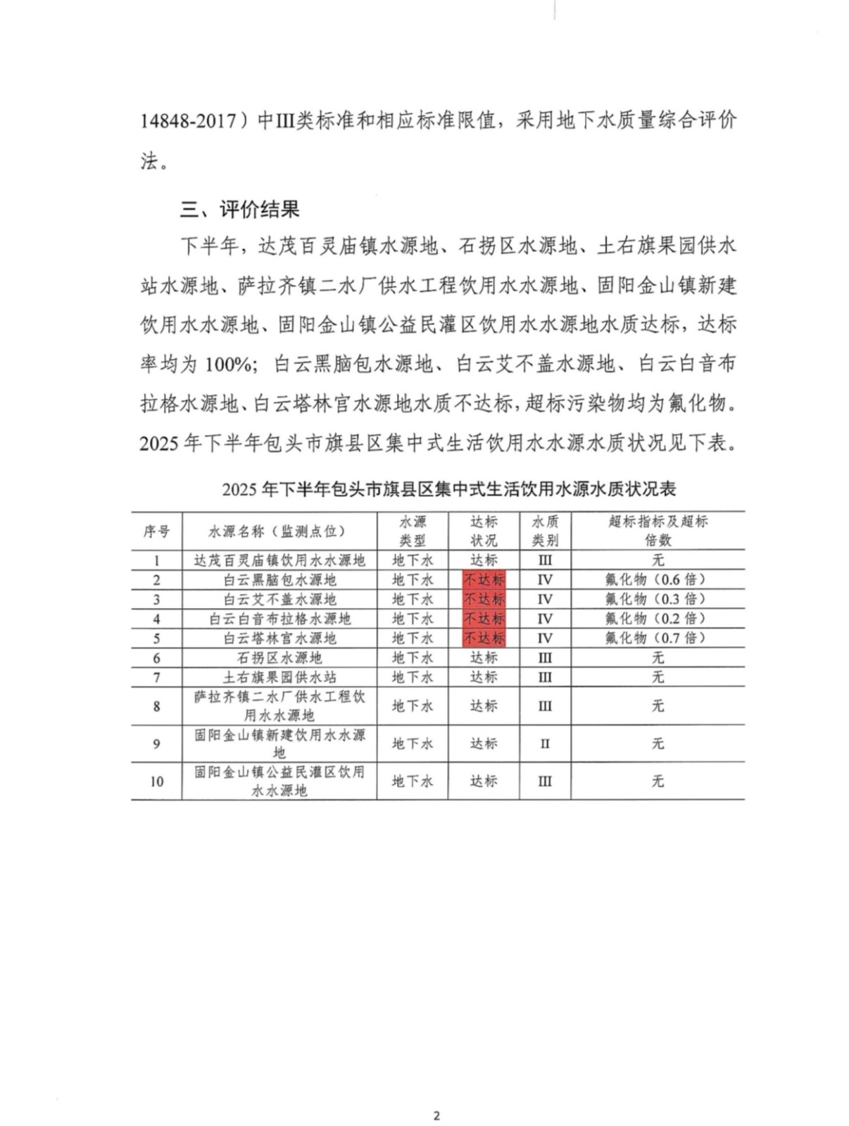 包头市旗县区集中式生活饮用水源水质状况报告