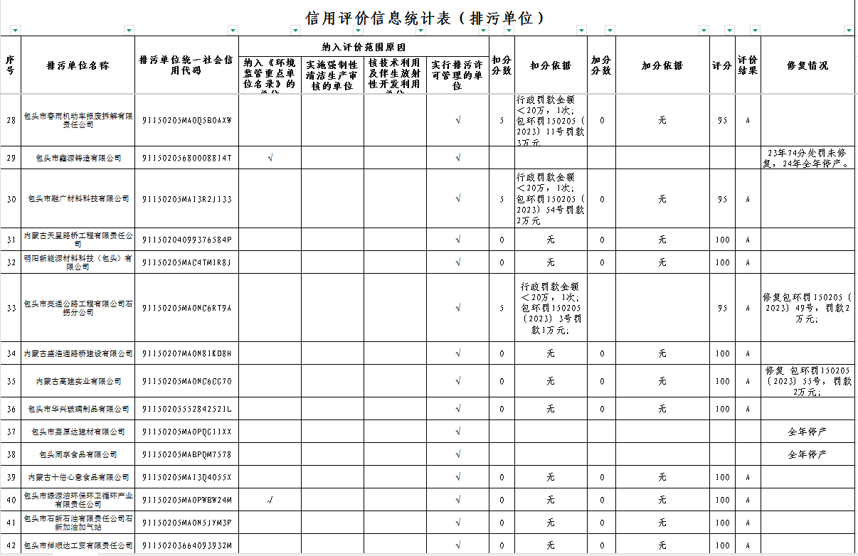 有15家企业处于停产状态(无需参与信用评价)分别是:包头市源星肥业有限公司、内蒙古垣发锌业有限公司、内蒙古永磊材料科技有限公司、包头市建盈炭素有限公司、包头市凯旋科技肥业有限责任公司、包头市鑫源铸造有限公司、包头市蒙弘防水建材有限公司、包头市锐绛科技特钢有限公司、包头市鑫胜网围栏有限公司、包头市嘉原达建材有限公司、包头同享食品有限公司、内蒙古包头市大青山冶炼有限公司、包头市溶增化工有限责任公司、内蒙古骆驼酒业集团股份有限公司玻璃分公司、包头市金星合金有限责任公司.
