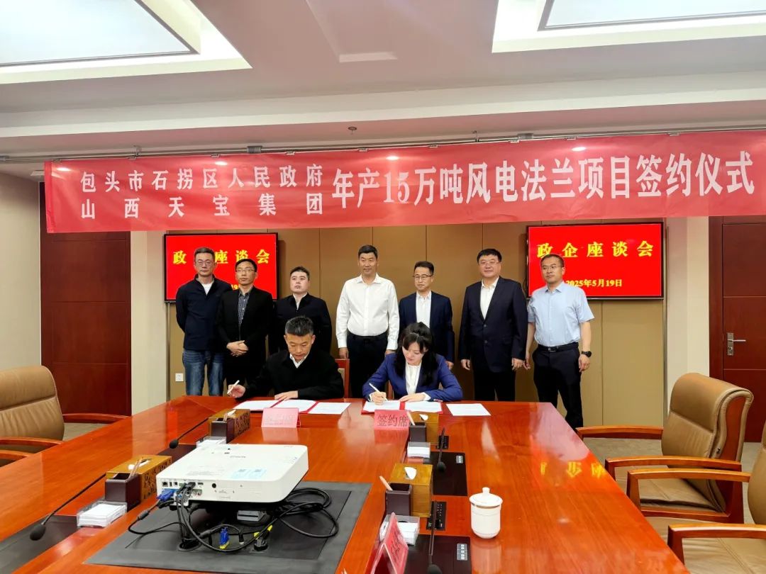 5月19日,石拐区与山西天宝集团举行年产15万吨风电法兰项目签约仪式,这是包头市风电装备产业发展又一重大标志性项目。该项目计划总投资约20亿元,占地规模约330亩,建成达产后预计可实现年产值15亿元以上,年税收2亿元以上,提供就业岗位500个。
