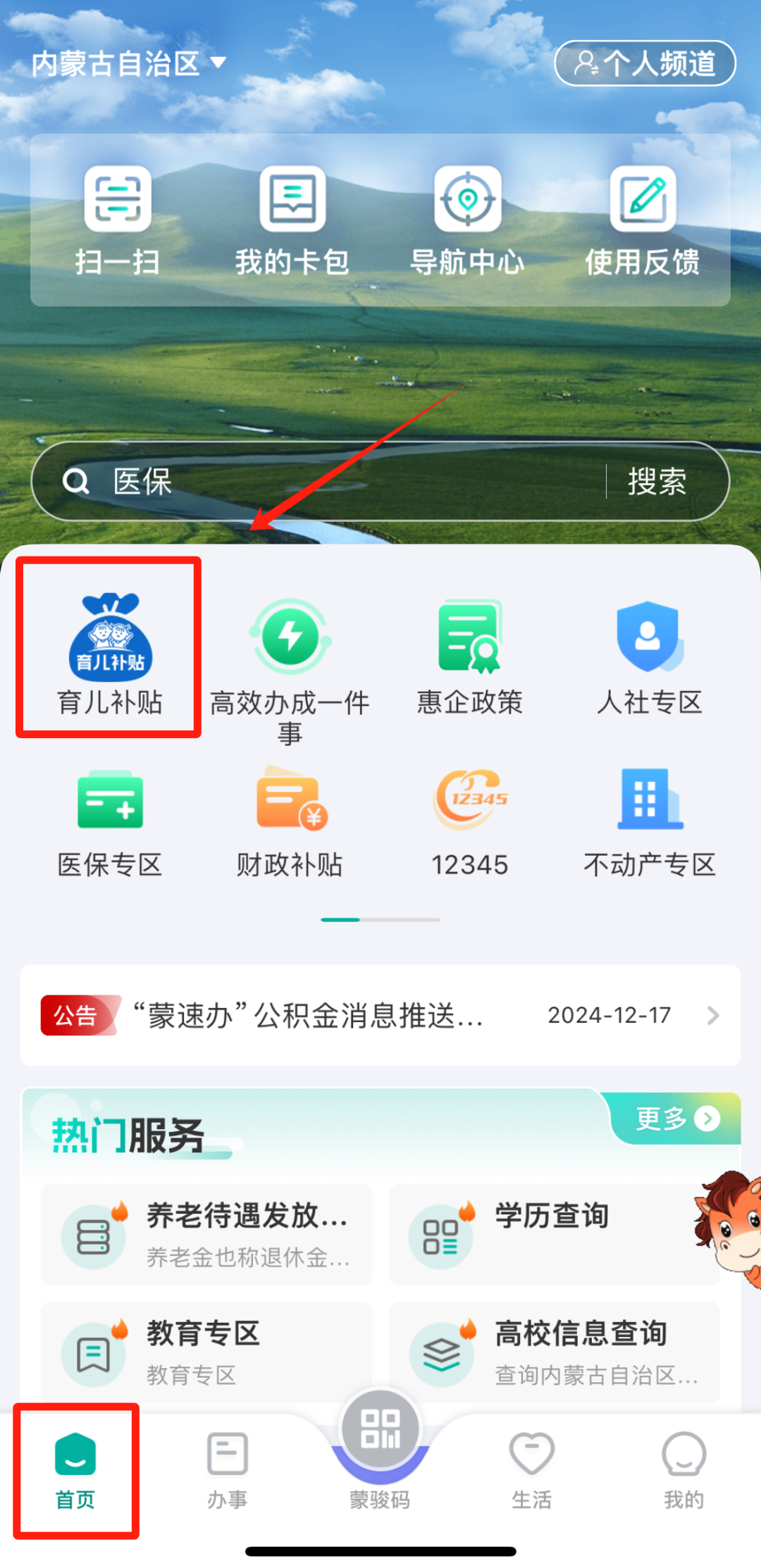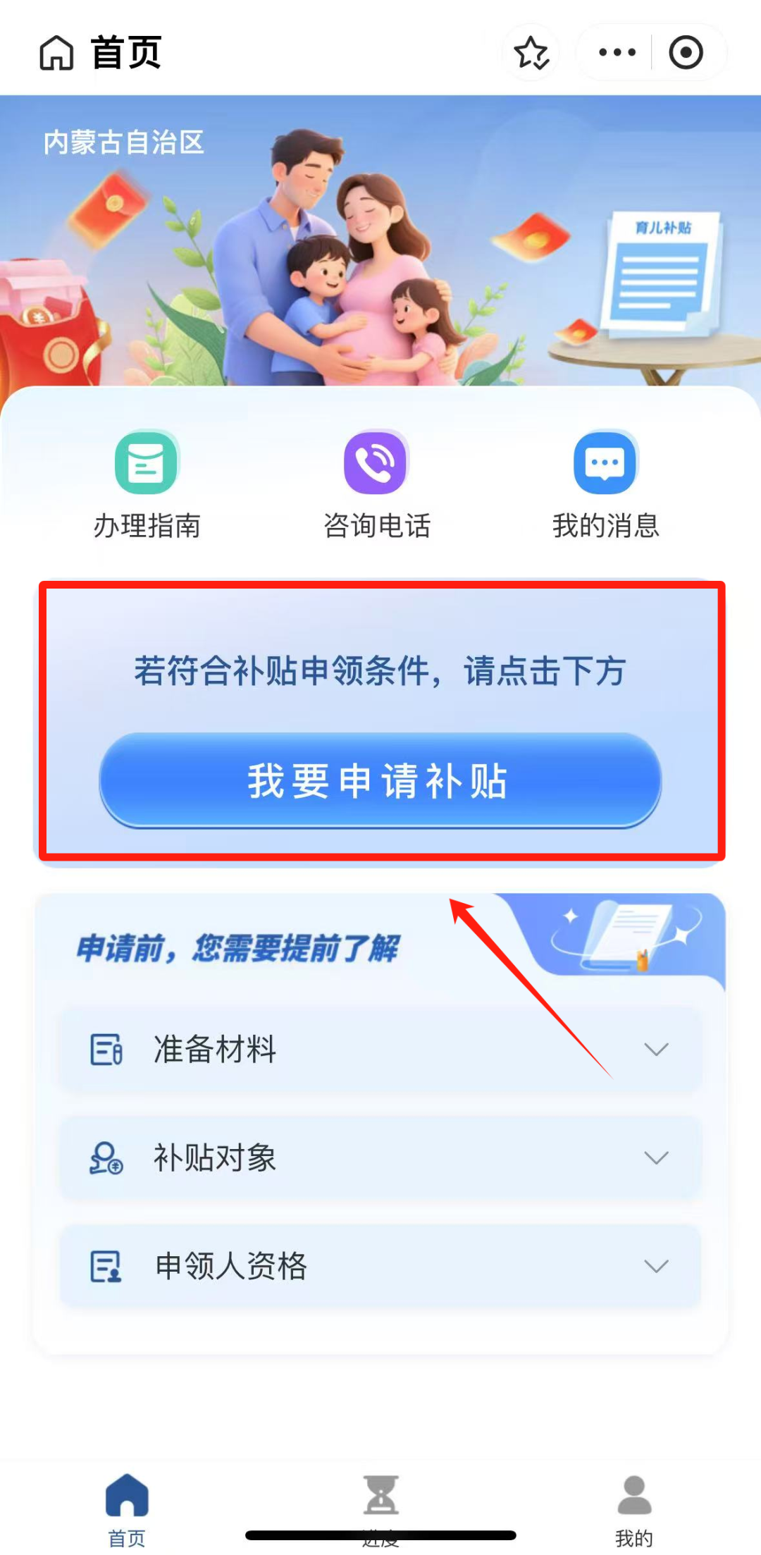 操作指南 一、“蒙速办”App 1、打开并登录“蒙速办”App、【首页】找到“育儿补贴”,点击进入专题页面。 2、进入“育儿补贴专区”,在最下方点击进入“补贴申领入口”,跳转到“蒙速办”支付宝小程序相关页面。 3、进入“蒙速办”支付宝小程序“育儿补贴”专题页面后,可详细了解育儿补贴——“办理指南”“咨询电话”“准备材料”“补贴对象”“申领人资格”“我的消息”等相关资讯和服务。 4、点击“我要申请补贴”,阅读“办理须知”后点击“我已阅读并确认”。 5、根据页面提示填写相关信息,上传相关材料证明文件,点击“保存并下一步”。 二、“蒙速办”小程序 1、打开并登录“蒙速办”支付宝或微信小程序。【首页】找到“育儿补贴”,点击进入专题页面。 2、进入“育儿补贴”专题页面后,可详细了解育儿补贴——“办理指南”“咨询电话”“准备材料”“补贴对象”“申领人资格”“我的消息”等相关资讯和服务。 3、点击“我要申请补贴”,阅读“办理须知”后点击“我已阅读并确认”。 4、根据页面提示填写相关信息,上传相关材料证明文件,点击“保存并下一步”。 育儿补贴计算器 操作步骤 1、打开并登录“蒙速办”App,【首页】找到“育儿补贴申领”,点击进入专题页面。 2、输入相关信息点击“立即计算”即可查看补贴金额。