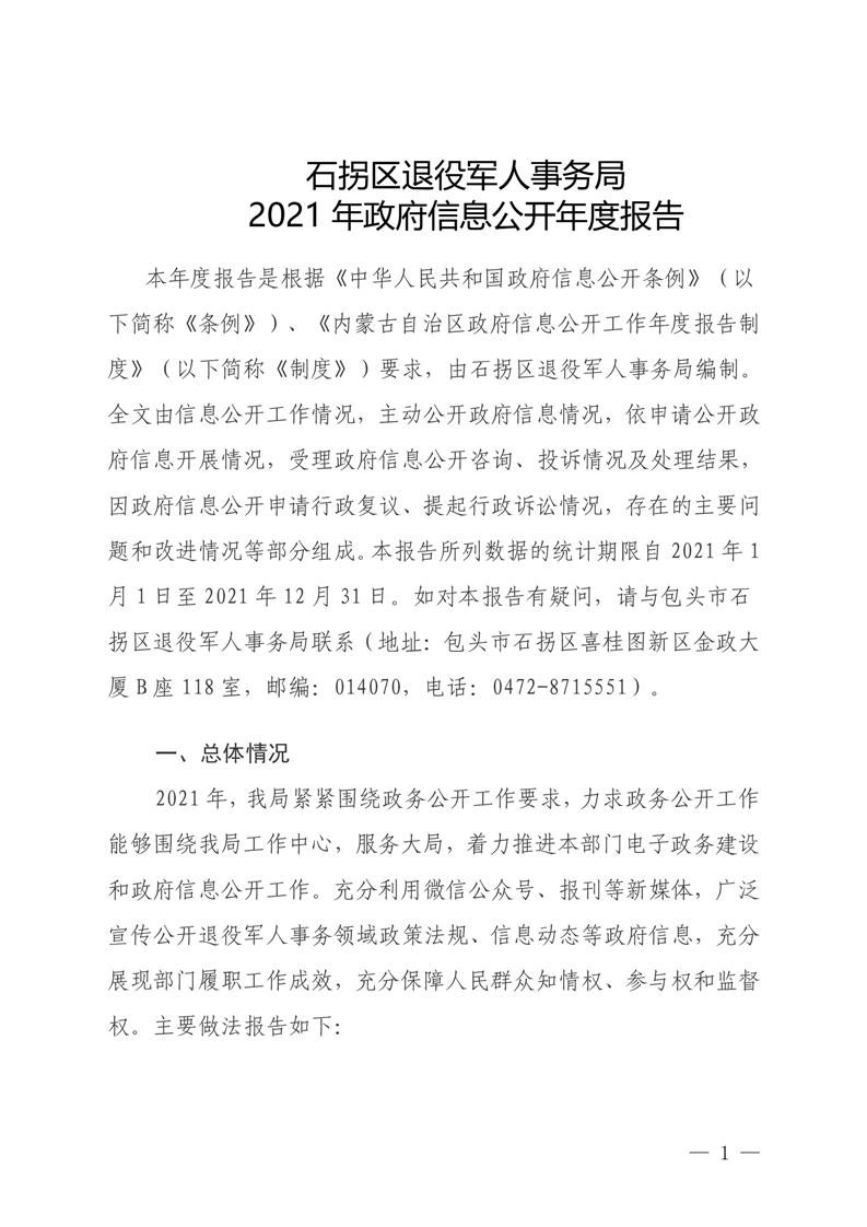 石拐区退役军人事务局 2021年政府信息公开工作年度报告