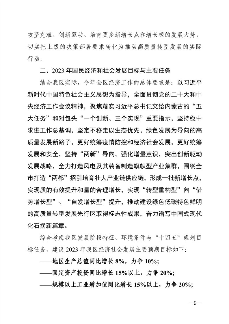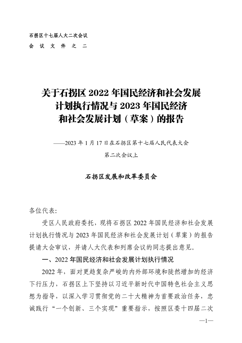 关于石拐区 2022 年国民经济和社会发展计划执行情况与 2023 年国民经济和社会发展计划(草案)的报告