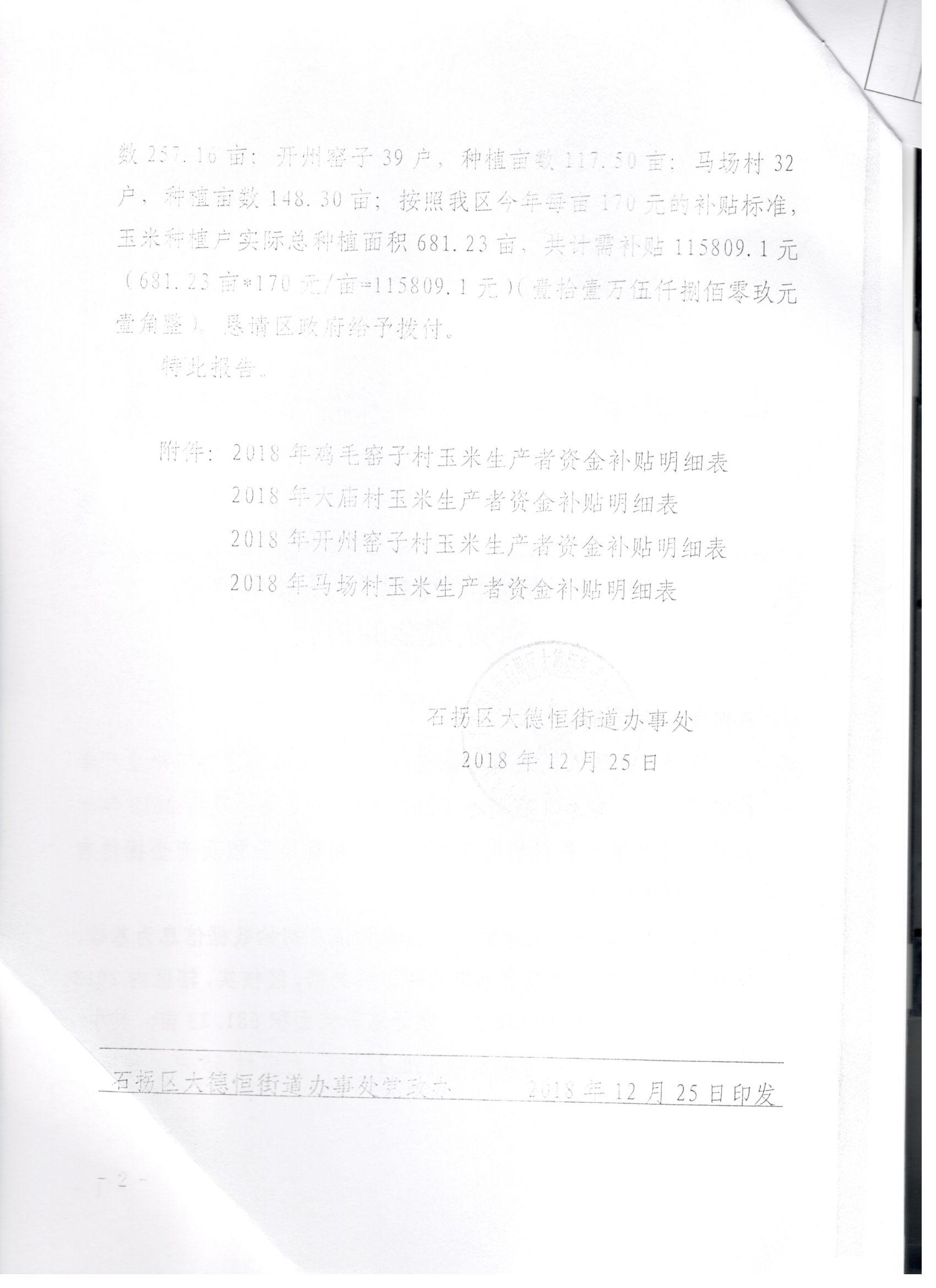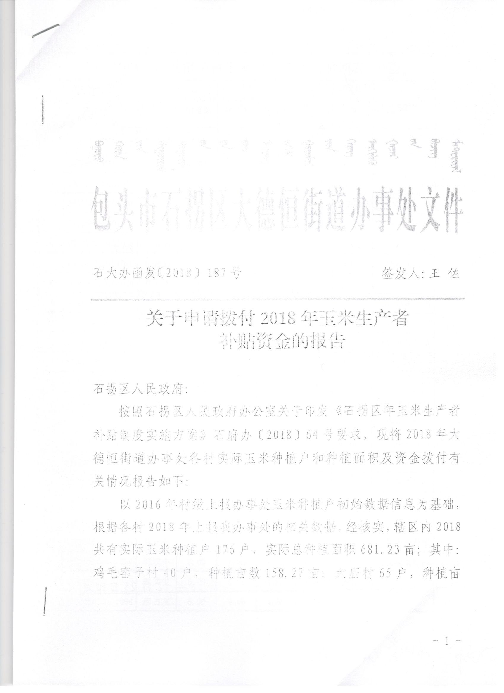 为做好2018年玉米生产者补贴发放工作,区政府结合本地区实际,制定了《2018年石拐区玉米生产者补贴实施方案》,经村、苏木镇街道逐级公示申报,区农牧局核查汇总后,最终核定石拐区2018年玉米生产者补贴面积8226.16亩,每亩补170元。