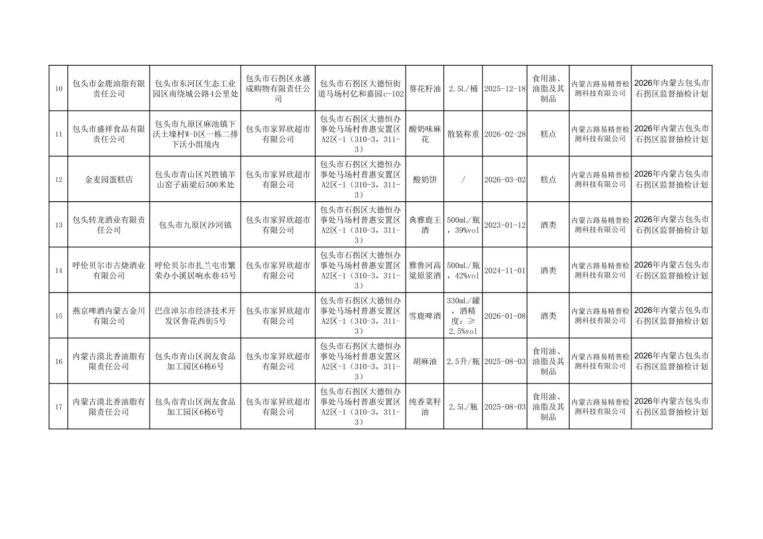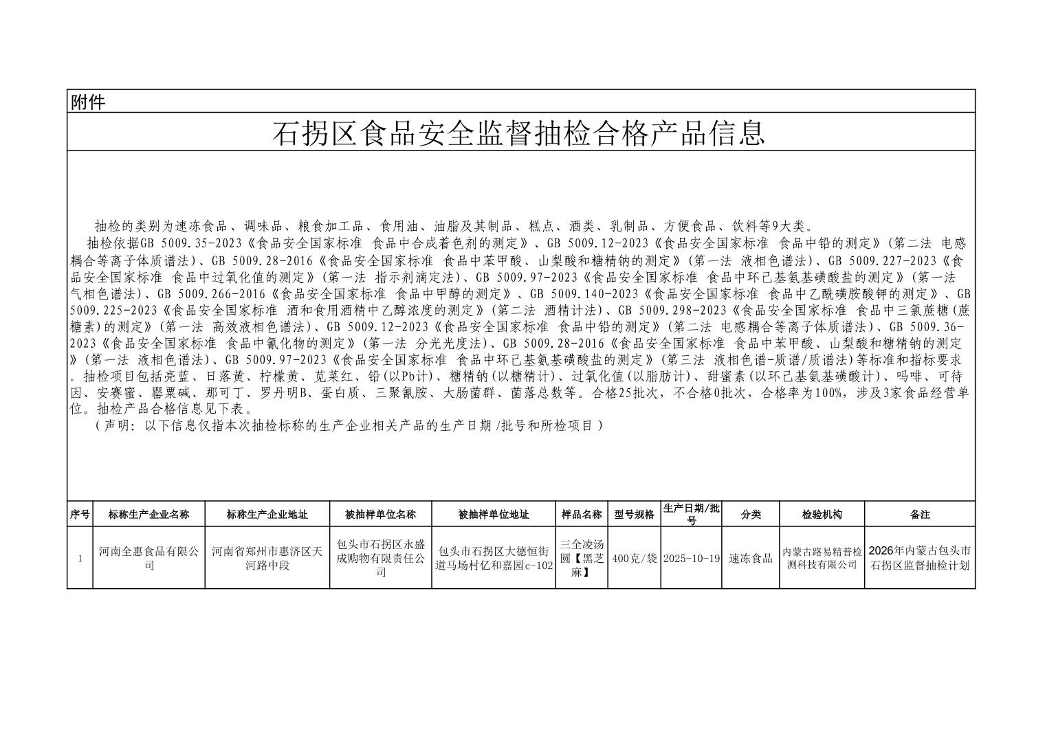 石拐区食品安全监督抽检合格产品信息