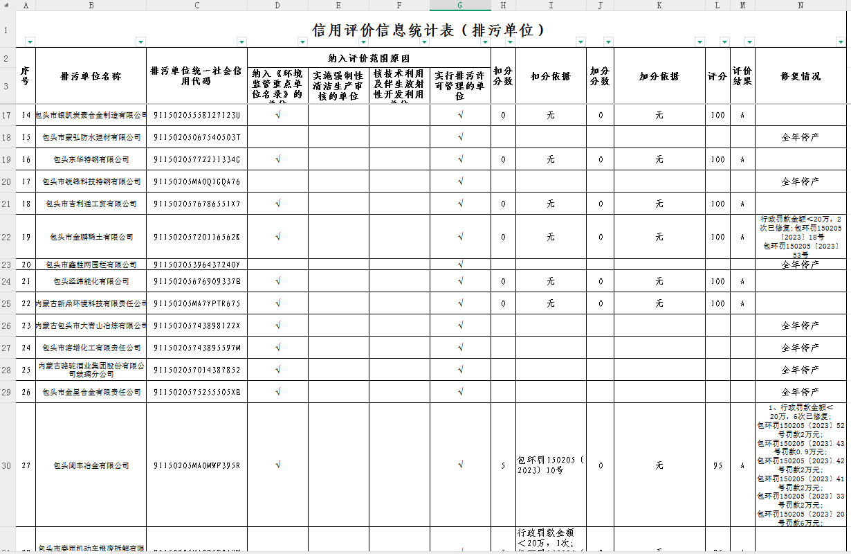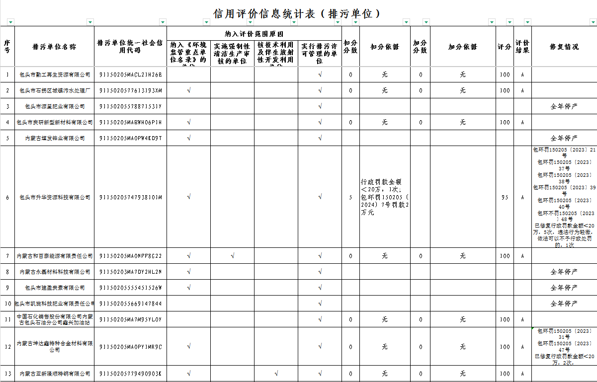 有15家企业处于停产状态(无需参与信用评价)分别是:包头市源星肥业有限公司、内蒙古垣发锌业有限公司、内蒙古永磊材料科技有限公司、包头市建盈炭素有限公司、包头市凯旋科技肥业有限责任公司、包头市鑫源铸造有限公司、包头市蒙弘防水建材有限公司、包头市锐绛科技特钢有限公司、包头市鑫胜网围栏有限公司、包头市嘉原达建材有限公司、包头同享食品有限公司、内蒙古包头市大青山冶炼有限公司、包头市溶增化工有限责任公司、内蒙古骆驼酒业集团股份有限公司玻璃分公司、包头市金星合金有限责任公司.