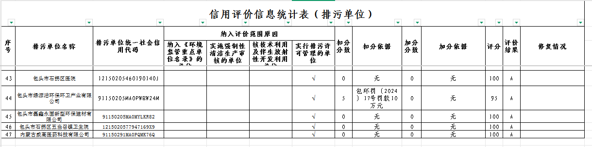2024年度,共有47家企业参与信用评价,其中等级为A级的企业共32家,停产不参加评分企业15家。具体扣分项和增分项详见附件:2024年度包头市石拐区区排污单位生态环境信用评价汇总表。