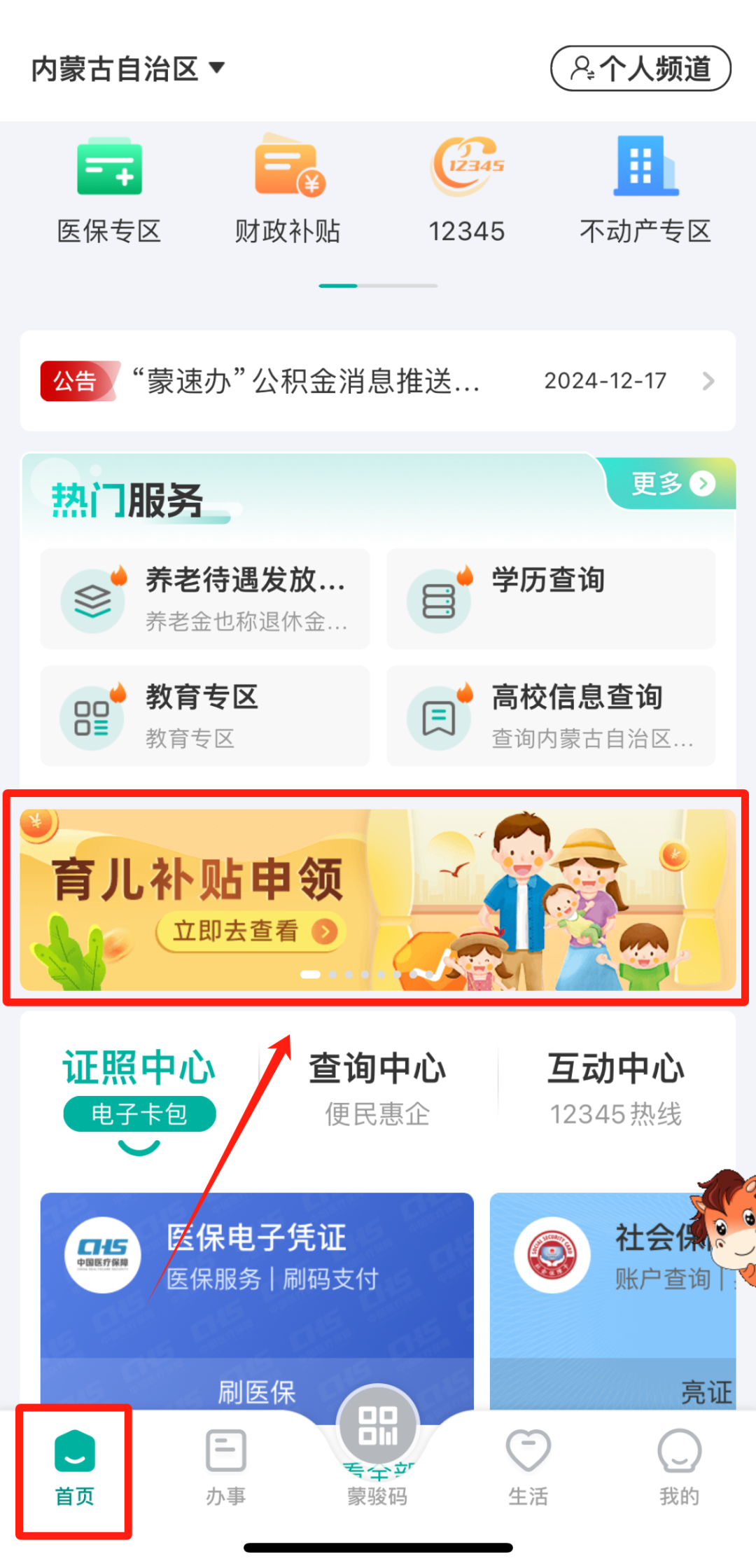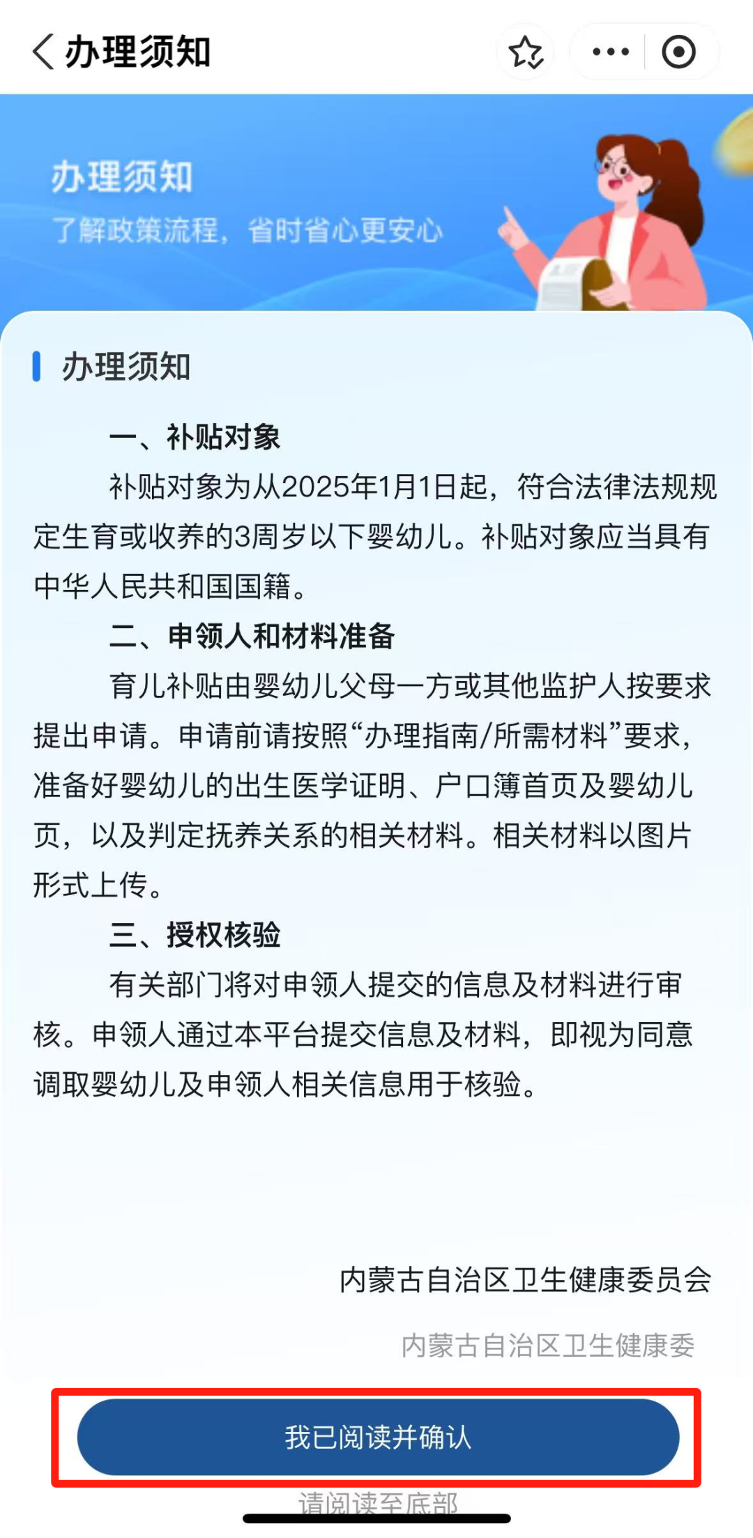 操作指南 一、“蒙速办”App 1、打开并登录“蒙速办”App、【首页】找到“育儿补贴”,点击进入专题页面。 2、进入“育儿补贴专区”,在最下方点击进入“补贴申领入口”,跳转到“蒙速办”支付宝小程序相关页面。 3、进入“蒙速办”支付宝小程序“育儿补贴”专题页面后,可详细了解育儿补贴——“办理指南”“咨询电话”“准备材料”“补贴对象”“申领人资格”“我的消息”等相关资讯和服务。 4、点击“我要申请补贴”,阅读“办理须知”后点击“我已阅读并确认”。 5、根据页面提示填写相关信息,上传相关材料证明文件,点击“保存并下一步”。 二、“蒙速办”小程序 1、打开并登录“蒙速办”支付宝或微信小程序。【首页】找到“育儿补贴”,点击进入专题页面。 2、进入“育儿补贴”专题页面后,可详细了解育儿补贴——“办理指南”“咨询电话”“准备材料”“补贴对象”“申领人资格”“我的消息”等相关资讯和服务。 3、点击“我要申请补贴”,阅读“办理须知”后点击“我已阅读并确认”。 4、根据页面提示填写相关信息,上传相关材料证明文件,点击“保存并下一步”。 育儿补贴计算器 操作步骤 1、打开并登录“蒙速办”App,【首页】找到“育儿补贴申领”,点击进入专题页面。 2、输入相关信息点击“立即计算”即可查看补贴金额。