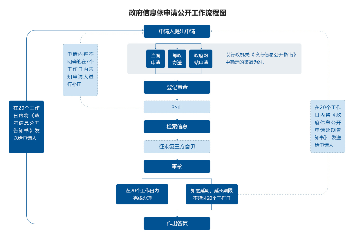 收到政府信息公开申请的行政机关将根据《中华人民共和国政府信息公开条例》,对申请的形式和内容进行必要的审查,不符合申请要求的将按照规定进行补正;符合申请要求的进入办理程序,一般在20个工作日内予以答复,如遇需要延期答复的,可延期20个工作日答复。