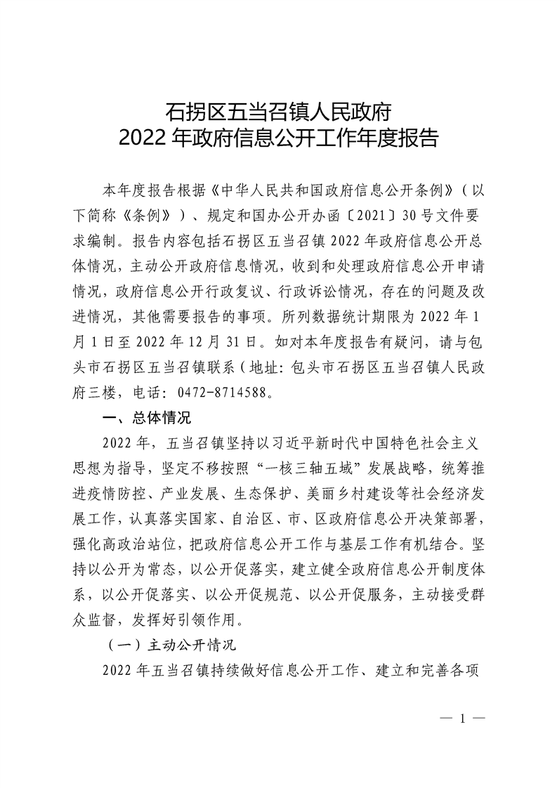 石拐区五当召镇人民政府2022年政府信息公开工作年度报告