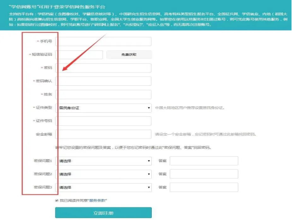 填写框内带*的全部内容,点击“立即注册”